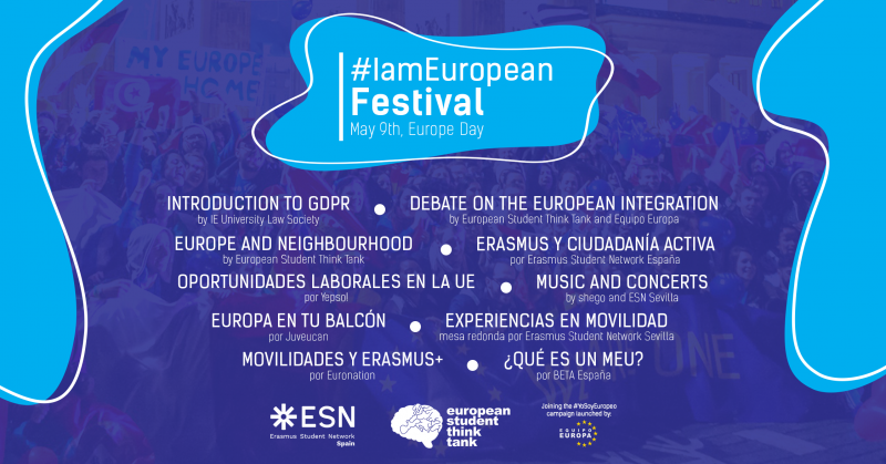 #IamEuropean Festival es la propuesta de Erasmus Student Network España (ESN España) y European Student Think Tank (EST) para reunir bajo un mismo cartel debates, talleres, sesiones musicales y mesas redondas de varios asociaciones e instituciones con motivo de la celebración del Día de Europa acogiéndonos a la campaña #YoSoyEuropeo lanzada por Equipo Europa. Las actividades se realizarán de forma online a través de Google Meets y serán retransmitidas en directo en la página de Facebook de Erasmus Student Network España.