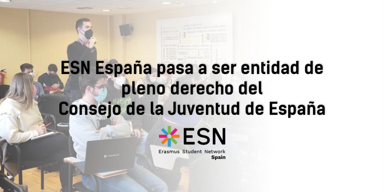Erasmus Student Network España pasa a ser entidad miembro de pleno derecho, junto a las entidades más representativas del tejido asociativo de nuestro país. “Esto marca un hito para ESN España, ya que nos permite llevar la voz de la Generación Erasmus a los espacios de máxima representación de las personas jóvenes en España“ afirma Miguel Hernández, presidente de ESN España. Además, Erasmus Student Network España está presente en muchos de los Consejos de la Juventud Autonómicos de nuestro país, como el Consejo de la Juventud de la Comunidad de Madrid, el Conseyu de la Mocedá del Principáu d`Asturies, el Consell Valencià de la Joventut o el Consejo de la Juventud de Cantabria. Esto, unido a la presencia en los Consejos Locales, permite a ESN España estar presente en todos los niveles de representación de las personas jóvenes en nuestro país.